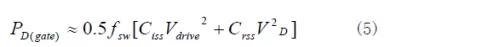 功率MOSFET驅(qū)動功率比雙極型功率晶體管高。MOSFET柵極有兩個與漏源極相連的等效電容,即柵源電容Ciss和漏源電容Crss。MOSFET柵極驅(qū)動的損耗來自于注冊MOSFET時輔佐電壓對柵極電容的充電,關(guān)斷MOSFET時又對地放電。柵極驅(qū)動損耗核算由式(5)給出。