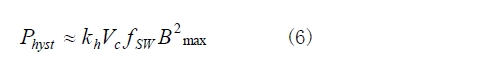 磁滯損耗與繞組的匝數(shù)和驅(qū)動方式有關(guān)。它決議了每個作業(yè)周期在B-H曲線內(nèi)掃過的面積。掃過的面積便是磁場力所作的功,磁場力使磁心內(nèi)的磁疇重新排列,掃過的面積越大,磁滯損耗就越大。該損耗由式(6)給出。