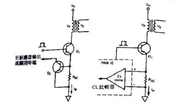 (a)圖:在輸出端有過(guò)載或短路情況發(fā)生時(shí),此刻初級(jí)電流會(huì)很快的添加,Rsc上的就會(huì)發(fā)生電壓,此電壓逾越B-E的導(dǎo)通電壓,那么Q2就會(huì)導(dǎo)通,就會(huì)把Q2集電極電位拉到地,假設(shè)接的是震動(dòng)電路此刻就會(huì)導(dǎo)至震動(dòng)電路中止作業(yè),然后到達(dá)維護(hù)的意圖。
