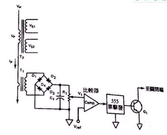 T1用來(lái)檢測(cè)T2的初級(jí)電流,T1后經(jīng)二極管整流后電容濾波,可變電阻R1用來(lái)設(shè)定比較器輸入端的臨限電壓,在正長(zhǎng)作業(yè)情況下,比較器的Vref參考輸入端電壓會(huì)高于電衛(wèi)器R1上的電壓,此刻比較器的輸出會(huì)在高電平,此刻的555IC(單激多諧振蕩器)會(huì)有低電平的輸出,使Q1堅(jiān)持在封閉情況。