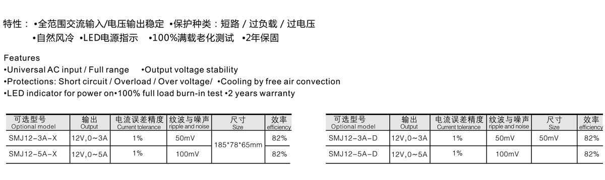 全范圍交流輸入/電壓輸出穩(wěn)定 有短路、過載、過熱保護(hù) 自然風(fēng)冷散熱 LED電源指示 100%滿負(fù)荷燒機(jī)測(cè)試