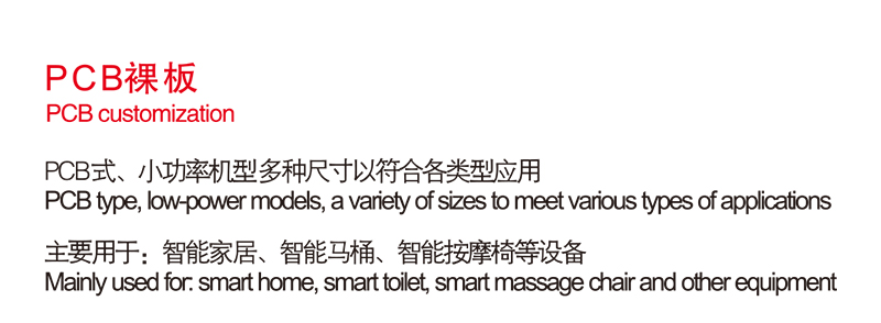 PCB式 小功率機(jī)型多種尺寸符合各類型應(yīng)用 主要用于:智能家居、智能馬桶、 智能按摩椅等設(shè)備